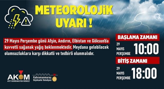 Büyükşehir Belediyesi AKOM, 29 Mayıs Perşembe günü Afşin, Andırın, Elbistan ve Göksun’da sağanak yağış beklendiğini belirterek dikkatli ve tedbirli olunması noktasında vatandaşları uyardı.