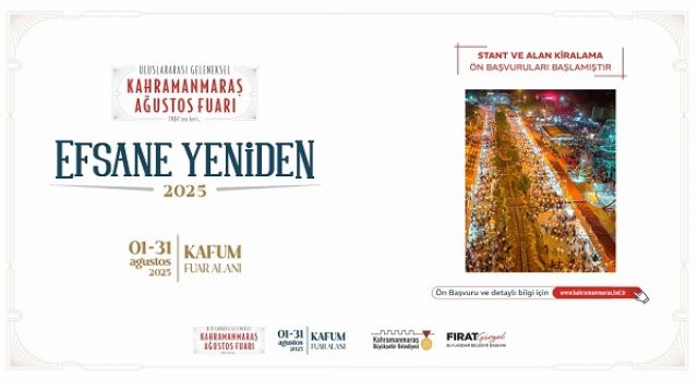 1 – 31 Ağustos 2025 tarihleri arasında KAFUM Fuar Alanında düzenlenecek olan fuarda yer almak isteyen esnaflar için stant ve alan kiralama ön başvuruları başladı. Fuarda stant açmak isteyen esnaf ve işletmeler, https://kahramanmaras.bel.tr/duyuru/2025/06/11/uluslararasi-geleneksel-agustos-fuari-esnaf-on-basvuru-formu adresi üzerinden çevrimiçi olarak başvuru yapabiliyor.