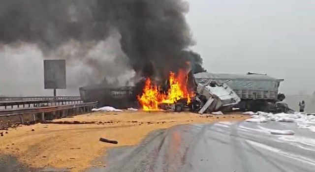 Kahramanmaraş-Gaziantep yolu üzerinde meydana gelen zincirleme trafik kazasında hububat yüklü 3 tır çarpıştı, çarpışmanın ardından araçlarda yangın çıktı.