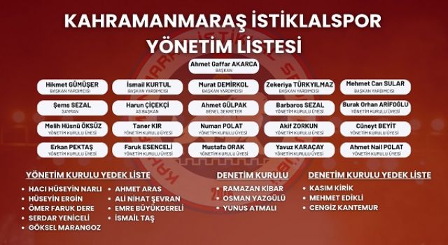 Kahramanmaraş İstiklalspor yönetimi Ahmet Gaffar Akarca başkanlığında yeni yönetim listesini açıkladı.