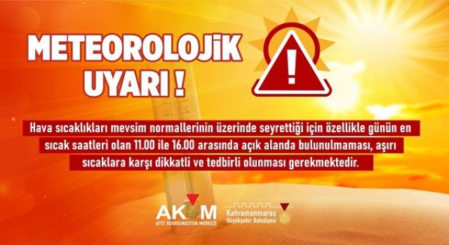 Büyükşehir Belediyesi AKOM, hava sıcaklıklarının mevsim normallerinin çok üzerinde seyrettiği ve sıcak havaların ilerleyen günlerde de etkisini sürdüreceğini duyurdu. Meteorolojik verilere göre, Kahramanmaraş’ta hafta boyunca sıcaklıkların 40 ila 46 derece arasında seyretmesi bekleniyor.